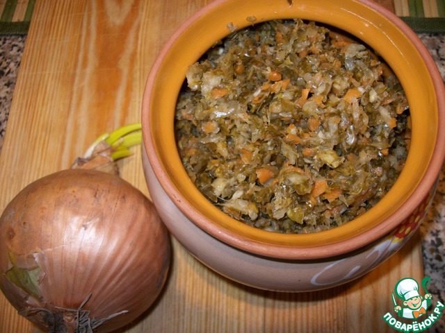 - Капуста квашеная (зеленая, (или серая по-другому), делается из верхних листьев капусты, которые сейчас обычно выбрасывают методом квашения. Капусту не режут, а рубят тяпкой, у нее при этом способе как - то по особенному образуется нужный сок.) — 2 горст.