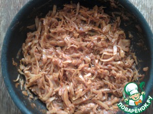 1. Сделать начинку. В данном случае - это тушеная капуста. Рецепт не оригинален, меня так учила мама. Мелко нарезать лук, обжарить до золотистого цвета. Нашинковать капусту, добавить к луку и обжаривать на большом огне постоянно переворачивая 10 минут. Добавить 0,5 стакана воды и тушить еще минут 20, накрыв крышкой. Через 20 минут добавить томатную пасту, сахар (в данном случае "Мистраль"), перец, уксус.