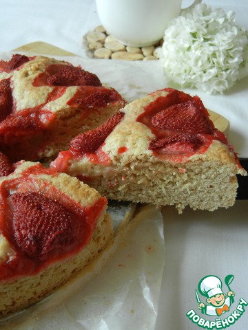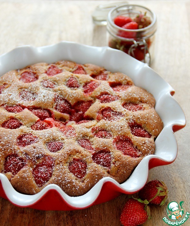 Разровнять поверхность и сверху уложить клубнику, разрезанную наполовину, срезом вниз. Выпекать в духовке, разогретой до 180 градусов, до сухой лучины. Не пересушите тесто!
