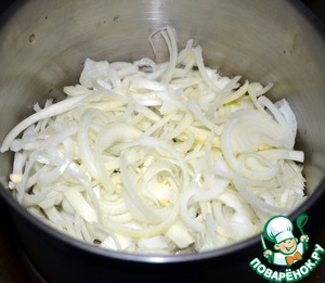 В кастрюле с высокими стенками разогреваем оливковое масло на медленном огне. Режем лук тонкими полукольцами и выклыдываем в кастрюлю, пассеруем. После того как лук стал мягким, добавляем нарезанный не очень мелко сельдерей. Продолжаем пассеровать на медленном огне почти до готовности.