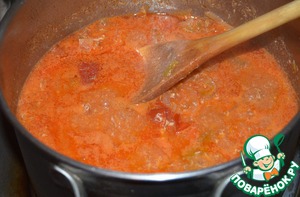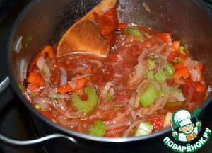 Добавляем томатный соус и нарезанный перец. После этого начинаем потихоньку вливать бульон или горячую воду до получения консистенции густого супа. Готовим на медленном огне в течение получаса, периодически помешивая.
