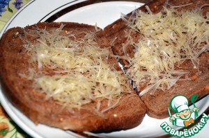 В это время в каждую тарелку да дно выкладываем 2 кусочка хлеба (подсушенного, обжаренного или приготовленного в гриле), сверху посыпаем тертым сыром. Сверху покрываем супом, украшаем базиликом и сразу же подаем.