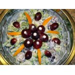 Тарелочку, в которой будем презентовать наш салат, украшаем получившимся соусом и ставим на неё застывшую вазочку из сыра. Аккуратно. стараясь не поломать красивые края. укладываем в неё овощи-фрукты. Две креветки порежем на три часи и положим в салат, а две, которые с хвостиками, подвесим сбоку на вазочку. Украшаем шнитт-луком и веточкой зелёного фенхеля. Соусом поливать только перед подачей и не очень много, стараясь попасть только на овощи, потому что "вазочка" может намокнуть и накренится в сторону и уже не будет так эффектно смотреться, как сейчас на фотографии.