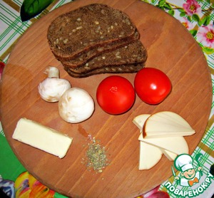 На фото весь не хитрый состав нашего вкусного завтрака: хлеб зерновой, сыр колбасный копченный, помидоры, грибы, сливочное масло и орегано