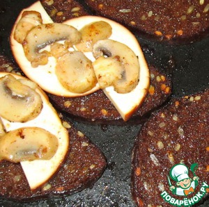 После того как удалим из сковородки грибы, в этом же масле обжарим с двух сторон хлеб, совсем немножко. После чего на 2 кусочка из четырех кладем сыр, сверху грибочки...