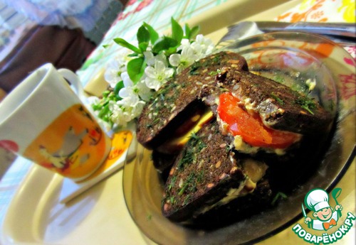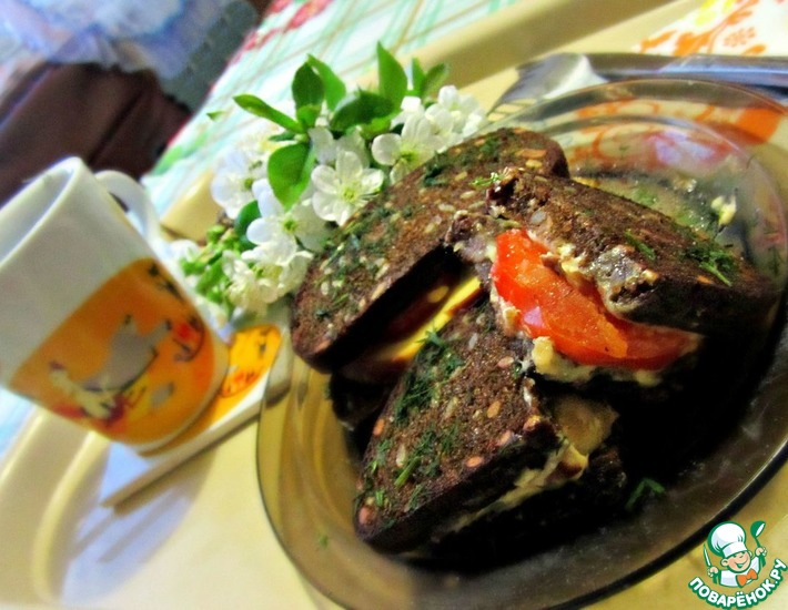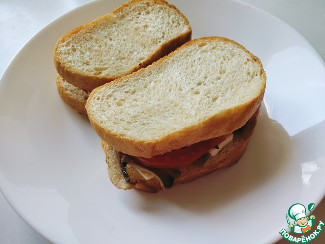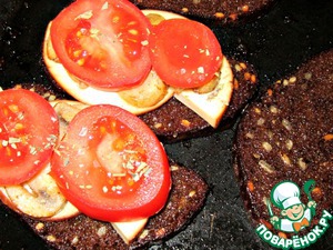 ... сверху грибов помидорки, посыпаем все орегано и закрываем оставшимися ломтиками хлеба. Переворачиваем бутерброд и накрываем сковороду крышкой на 3-4 минуты. И все, наш завтрак готов!