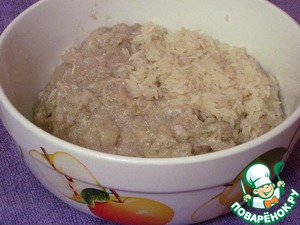 Смешать готовый рыбный фарш с рисом, посолить, поперчить, тщательно перемешать.