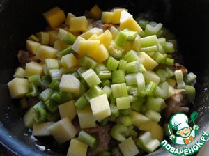 Добавляем картофель, сельдерей. Перемешиваем. Добавляем вино.
