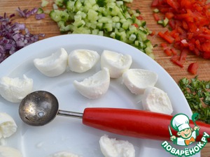 В моцарелле вырезать специальной ложкой или просто обычной чайной, но с заточенным краем, углубления. Дно у каждой моцарелки рекомендую слегка срезать ножом для будущей устойчивости.