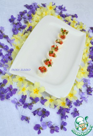 И начинить каждый шарик моцареллы. Выставить в ряд, или по кругу, или покрыть полностью всё дно блюда. Я обычно ещё сверху кладу накрест несколько тонких пёрышек зелёного лука. На столе смотрится прекрасно. Ну, а у нас весна, поэтому сегодня он в моей цветочно-цветовой гармонии не вписался.