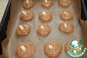 Миндальную массу выложить в кондитерский пакет и отсадить печенья на противень, застеленный пекарской бумагой и украсить миндалем.