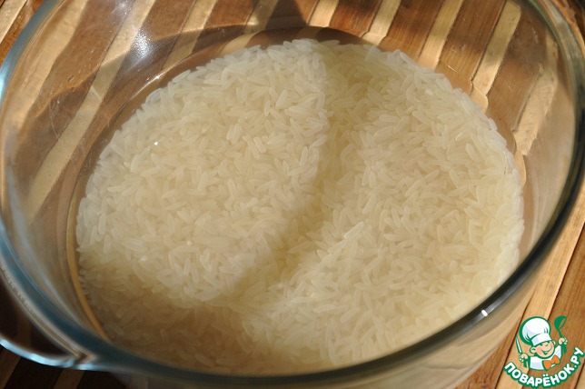 Рис промываем несколько раз до прозрачной воды. Заливаем водой, чтоб только прикрывала рис. Оставляем на 1 час. После доливаем 350 мл воды, доводим до кипения на сильном огне, уменьшаем до минимального и варим 20 мин.