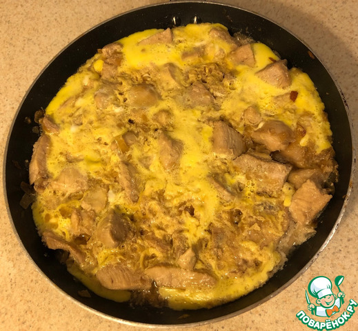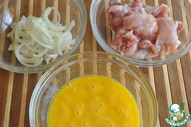 Пока замачивается рис, отделяем филе от кости, нарезаем небольшими кусочками. Лук режем тонкими полукольцами. Яйца слегка взбиваем.
