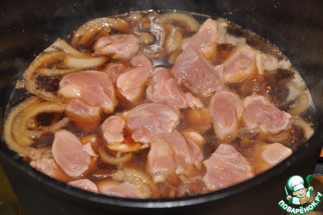 На дно кладем лук, на него кусочки курицы. Закрываем крышкой и готовим 7-8 мин. Не перемешиваем, только немного потряхиваем сотейник.
