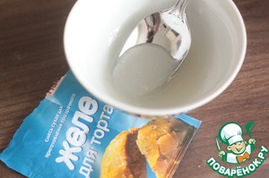Для меренги нам понадобится 1 пакет желатина, который нужно развести водой. У меня желатина не оказалось, и я использовала желе для торта. Залила пакетик 50мл. воды.