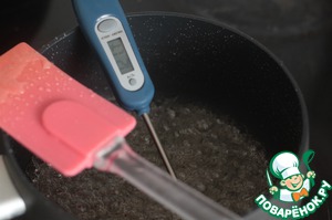 200гр. сахара и 100мл. воды соединить в кастрюле и прогревать до температуры 120 градусов. Я засекала время, у меня на это ушло 5 минут.