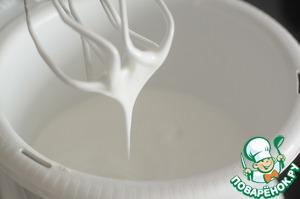 Белки взбить с ванильным сахаром, щепоткой соли и капелькой лимонного сока до устойчивых пиков. Медленно ввести горячий сироп, взбить еще 1 минуту, добавить желатин и взбивать еще 2 минуты на высокой скорости.
