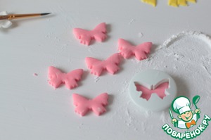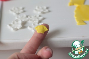 Из желтой мастики вырезаем трапецию, немного закругляем ее края.