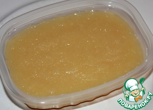 Фруктово-рисовую массу слегка охладите и выложите на плоскую поверхность толщиной в 1 см. Нужно выждать сутки, чтоб масса застыла. По виду и консистенции напоминает засахаренный мед. (Если эту массу заморозить в морозильнике, иногда перемешивая, получится прекрасный фруктовый щербет или фруктовый лед.) После этого порезать на кусочки и ириски готовы. Но я решила сделать наивкуснейшие конфеты с рисовой начинкой.