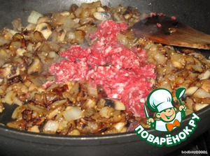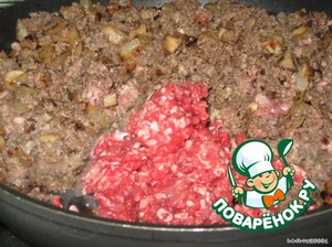 Вот тут она посолила и поперчила лук и начала помаленьким жменькам ( порциям) добавлять фарш
