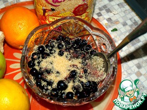 Черную смородину засыпьте сахаром. Взбейте ягоду в блендере, добавьте апельсиновый сок и процедите через сито.
