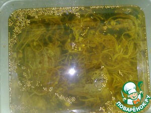- Соус (пряный соус: лук репка (10 гр), чеснок (2 зубочка), анчоус консервированый (1 шт), имбирь – корень или молотый (1 ст.л.), перец горошек (1/2 ч.л.), семена горчицы (3 ложки), карри (1/2 ч.л.), молотая корица (можно палочку), красный перец (0,5 ч. л), гвоздика (1/2 ч.л.), кардамон (1 ст.л.), уксусная кислота (2 ч.л.), сахар (100 гр), соевый соус (1/2 стак.), мандарин (3 дольки), вода (1 стак..) — 2 ст. л.