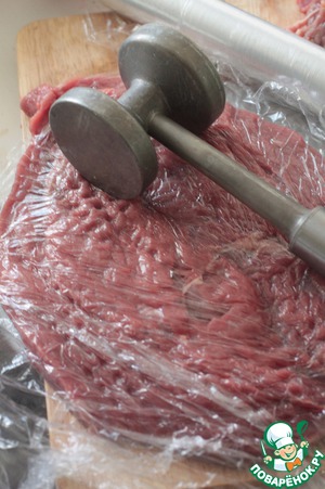 Кусок говядины разрезать вдоль не до конца и раскрыть, как книгу. Хорошенько отбить через пленку, чтобы не повредить волокна.