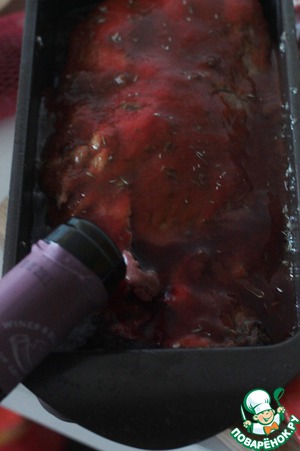 Выложим рулет в глубокую форму, я использовала форму для кекса, зальем сверху соусом и добавим вина.