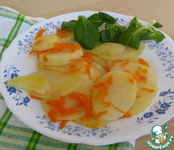 На дно мультиварки выливаем растительное масло, выкладываем картофель, посыпаем тертой на мелкой терке морковью. Заливаем воду. Добавляем соль и перец по вкусу.