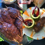 На деревянные шампуры насадили колбаски из фарша, чуть масла оливкового на них - и в духовку. Разогрейте ее до 200*C перед этим