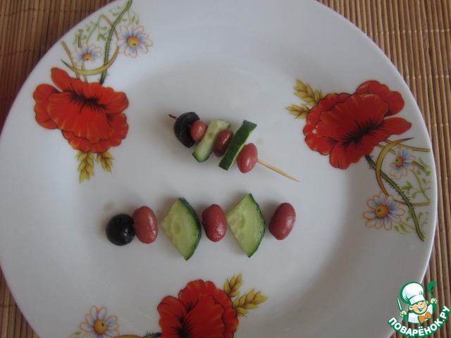 Канапе делаем из фасоли, огурцов и маслин, сложенных вот в таком порядке. В качестве шпажки используем зубочистки.