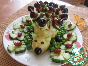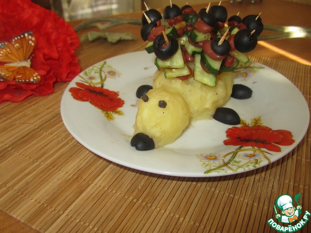 Теперь из полученного картофельного "теста" формируем тельце ежика, лапки, хвостик (правда, я не знаю, есть ли он у ежика =) ) и носик делаем из маслин, разрезанных пополам, а глазки - из горошин черного перца.