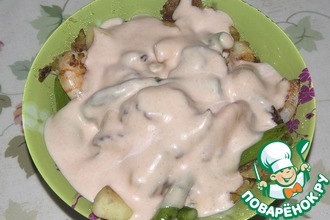 Приготовить соус: смешать полстакана домашнего (!) томатного сока с мукой, добавить сахар и соль по вкусу, выдавить чеснок, хорошенько перемешать.