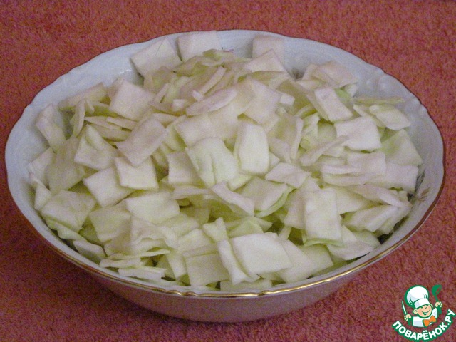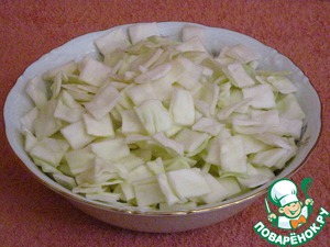 Капусту разобрать на листья, на сколько возможно. Срезать с листьев утолщения и нарезать шашечками.