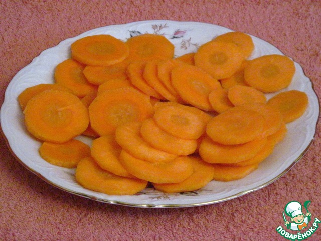 Морковь очистить и нарезать тоненькими кружочками, немного толще, чем нарезают для корейской моркови.
