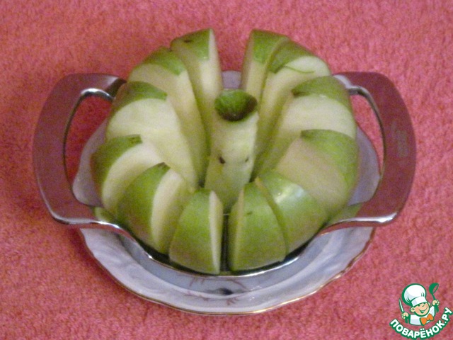 Яблоки для салата лучше брать зеленые, плотные с кислинкой. Не очищая от кожуры, разделить с помощью приспособления на сегменты.