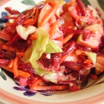 Хранится салат долго, от времени становится только еще вкуснее. Советую, время от времени, набирая салатик в тарелочку, перемешивайте содержимое кастрюли, чтобы маринад равномерно распределялся по салату, окрашивая все овощи свекольным соком. -