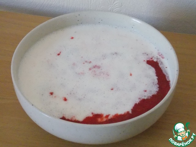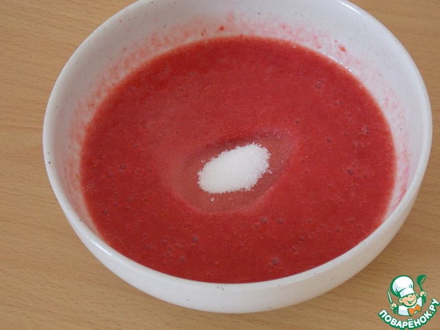 Клубнику (если замороженная, то размораживаем) взбиваем блендером в пюре. Добавляем 2 ст. л. сахара. Если клубника была свежая, то на этом можно и остановиться. Если же замороженная (как в моем случае), то я предпочитаю перестраховаться и пастеризовать массу. Для этого я просто ставлю миску с клубникой в микроволновку и довожу почти до кипения. Затем пюре охлаждаем.