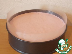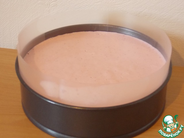 Разъемную форму выстилаем по периметру ацетатной лентой. Если ее нет (как у меня), то сгодится разрезанный на полоски пластиковый конверт (доступный в любом магазине канцтоваров) или пищевая пленка. На дно формы кладем корж. Теперь нашу суфле-массу надо хорошо перемешать лопаточкой: при взбивании на поверхности образуется большое количество пузырьков, на торте они нам не нужны, так как смотрится непрезентабельно. При перемешивании мы эти пузырьки разбиваем и теперь уже выливаем поверх коржа. Ставим в холодильник на несколько часов. У меня - на ночь. -