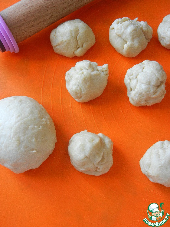 Достаем наше тесто и делим на 10-12 одинаковых порций.