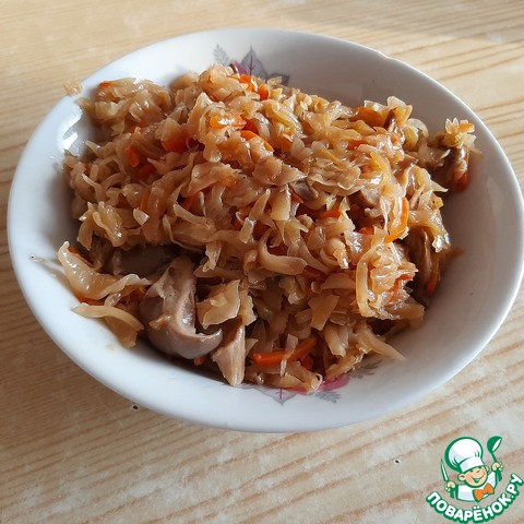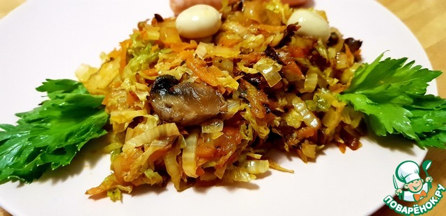 Когда капуста уже готова, соединяем ее с грибами и перемешиваем.