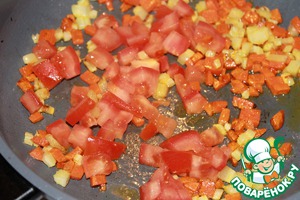К обжаренным моркови и сельдерею добавляем перец, помидор,