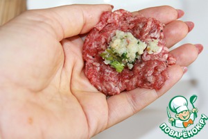 Из готового фарша делаем лепешечку, выкладываем в серединку начинку из сыра, мелиссы и фундука