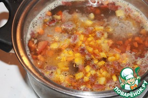 Затем добавляем зажарку в суп, кипятим пару-тройку минут, солим, перчим по вкусу