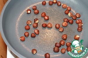 Фундук прокалить на сковородке и очистить от кожицы. Затем порубить на кусочки 1-2 мм