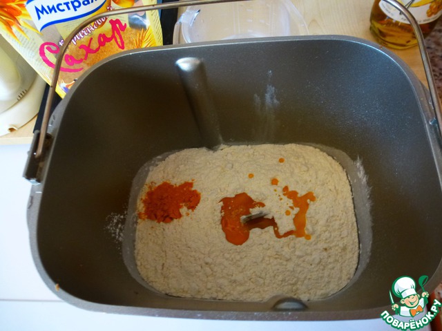 Добавляем, воду, масло, уксус. Либо добавляете все ингредиенты в последовательности указанной в инструкции к Вашей хлебопечке.