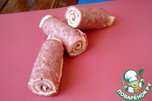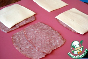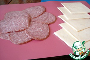 Салями режем тоненькими ломтиками (или берём готовую нарезку). Сыр любой, мягкий в пластинах.