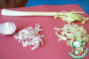 Лук тоненько режем полукольцами. Сельдерей тоненькими кусочками.