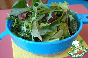 Салатный микс из молодых листьев моем и отставляем, чтобы стекла водичка и листья обсохли.