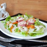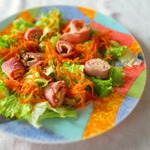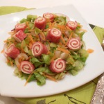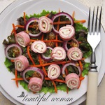 Далее салатный микс, морковь, лук и сельдерей перемешать, выложить в салатник. Посолить и заправить салат заправкой. Дополнить наш салат рулетиками из салями с сыром.